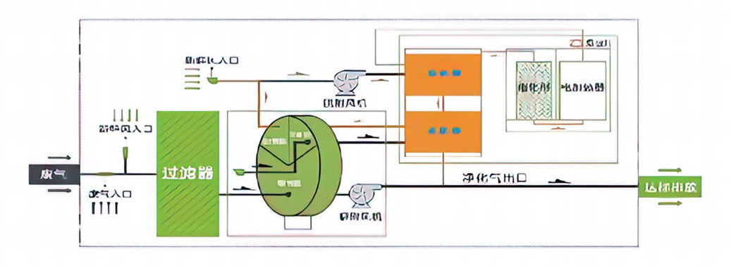 4. Zeolite rotary wheel recovery stage: After the zeolite rotary wheel is regenerated by high-temperature heating, the adsorption effect will deteriorate with the increase of the zeolite temperature. To maintain the zeolite's ability to repeatedly adsorb waste gases, it is essential to cool the zeolite using a cooling fan. This process ensures the zeolite retains its cyclic adsorption capabilities.
